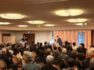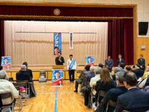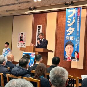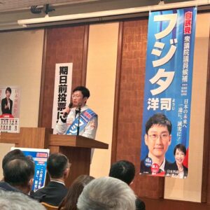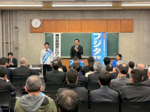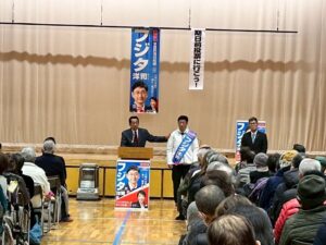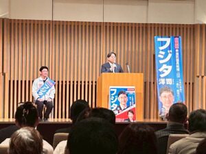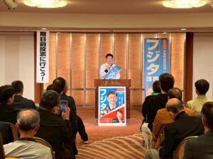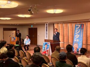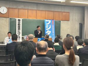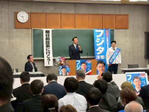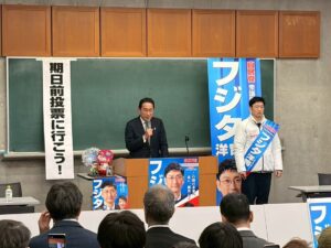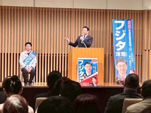フジタ洋司候補の個人演説会に参加いたしました。岸田文雄元総理が駆けつけてくださり、大変力強い応援をいただきました。
