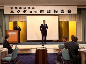 また夜には、京都市会議員ムクダ隆知市政報告会に出席しました。