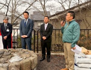 西脇京都府知事、安田向日市長をはじめ、多くの関係者の皆様と共に工事の安全を祈願し、盛土に鍬入れを行いました。