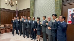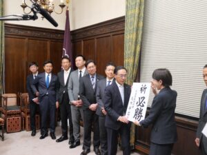 衆議院本館幹事長室に於いて西脇隆俊京都府知事の推薦証交付式が行われ、高市早苗総理より推薦証が手交されました。